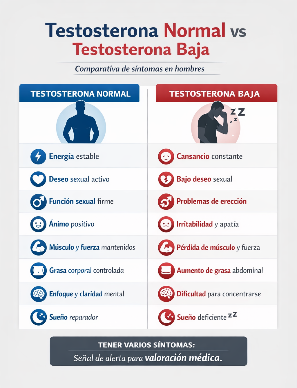 No todos los hombres con testosterona baja tienen los mismos síntomas, y no todos los síntomas significan testosterona baja.
